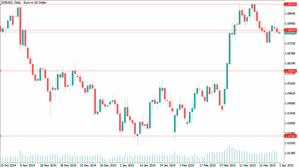 EUR/USD remained range-bound on Tuesday, hovering near the 1.0800 level as investors braced for U.S. President Donald Trump’s long-anticipated “reciprocal” tariffs package, set to be announced on Wednesday at 19:00 GMT (4:00 PM EST). The details of the tariff plan remain uncertain, with previous proposals shifting multiple times or facing delays—Trump has already postponed similar announcements four times since taking office 71 days ago.