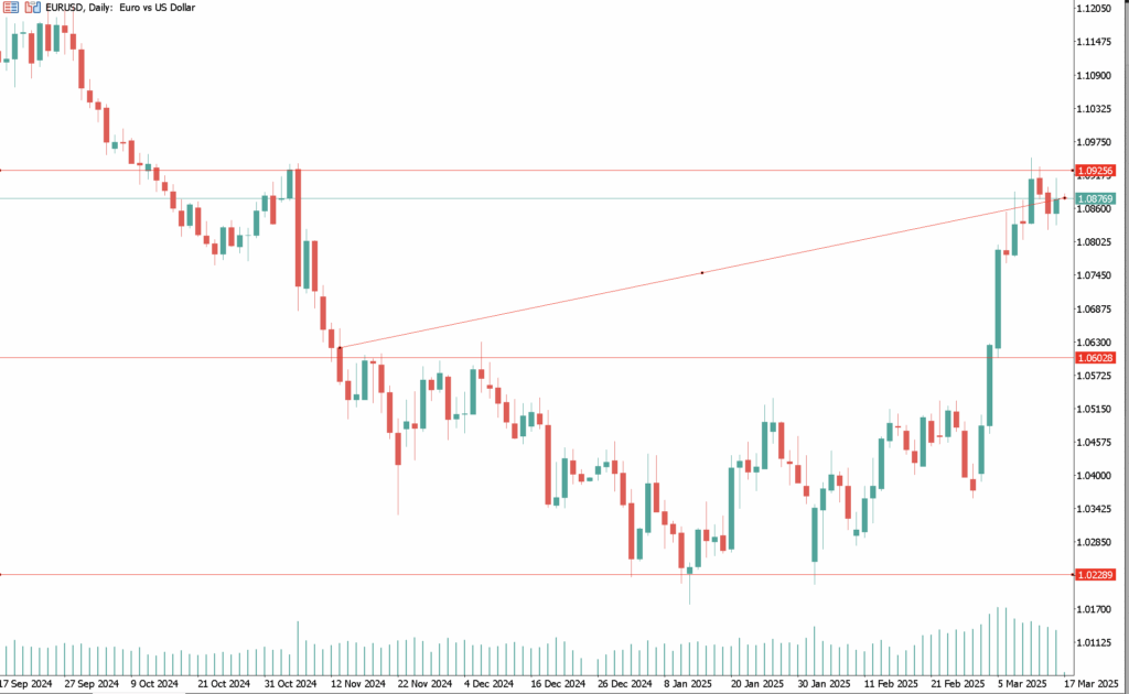 The first obstacle for the EUR/USD is at 1.0946 (high on March 11, 2025). A break above this level would open the way to 1.0969 (23.6% Fibonacci retracement), with the next target at the psychological level of 1.1000.