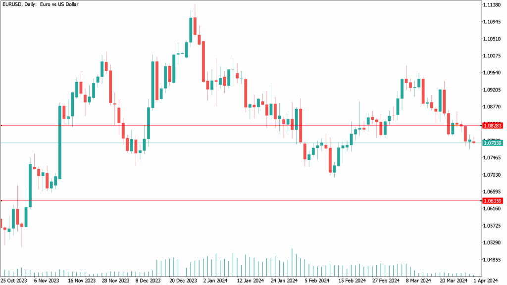 EUR/USD technical indicators are likely to move towards oversold saturation levels. At the start of April trading, the EUR/USD is moving below the psychological support level of 1.0800 with losses extending to 1.0767, its lowest level in a five-week span.
