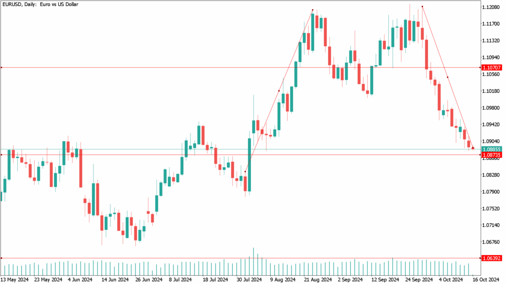 The EUR/USD pair continued its bearish trend on Tuesday, dropping about one-fifth of a percent and sliding below the 200-day Exponential Moving Average (EMA). The price closed below the 1.0900 level for the first time since early August. The pair is now down nearly 3% from its late September highs, which were just above the 1.1200 level.